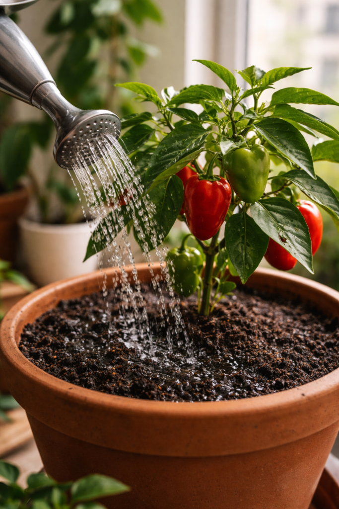 A rega não afeta apenas a saúde da planta — ela influencia diretamente se a pimenteira vai ou não produzir frutos.